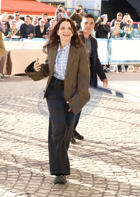 La Présidente du Jury Juliette Binoche à son arrivée à l'hotel Martinez la veille de l'ouverture du 78ème Festival International du Film de Cannes, le 12 mai 2025. © Denis Guignebourg/Bestimage Celebrities arrive at the Martinez Hotel during the 78th Cannes International Film Festival
