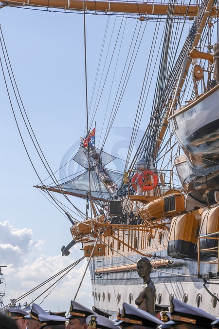 at the maritime station this morning the city authorities and school children welcomed the navy training ship Amerigo Vespucci, which stopped in Naples during the world tour that lasted two years, Naples, Italy 13 May 2025, Credit:Fabio Sasso / Avalon