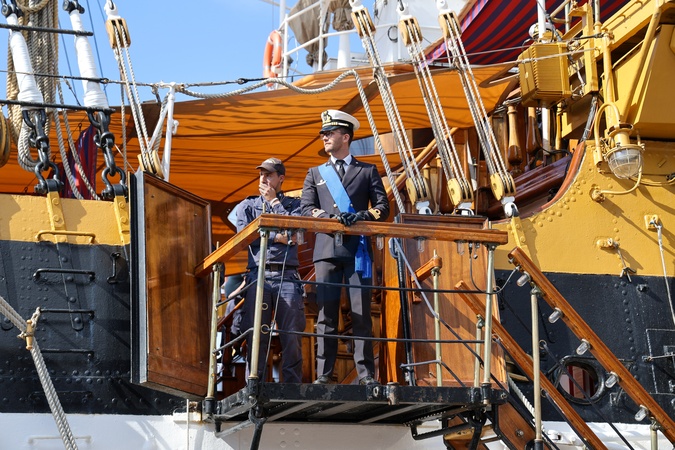 at the maritime station this morning the city authorities and school children welcomed the navy training ship Amerigo Vespucci, which stopped in Naples during the world tour that lasted two years, Naples, Italy 13 May 2025, Credit:Fabio Sasso / Avalon