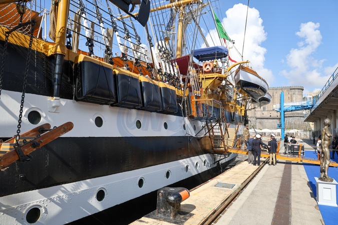 at the maritime station this morning the city authorities and school children welcomed the navy training ship Amerigo Vespucci, which stopped in Naples during the world tour that lasted two years, Naples, Italy 13 May 2025, Credit:Fabio Sasso / Avalon
