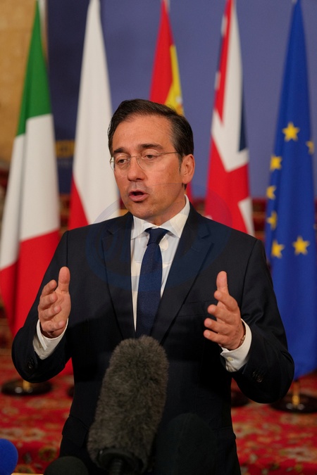 Spain's Foreign Minister Jose Manuel Albares Bueno speaks to the media as he arrives for talks on Ukraine and the future of European security hosted by Britain's Foreign Secretary David Lammy at Lancaster House in London, Britain, May 12, 2025., Credit:Carlos Jasso / Avalon