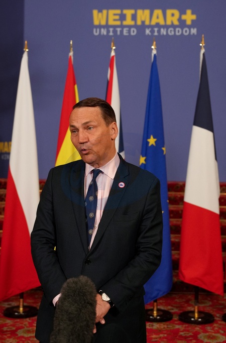 Poland's Foreign Minister Radoslaw Sikorski speaks to the media as he arrives for talks on Ukraine and the future of European security hosted by Britain's Foreign Secretary David Lammy at Lancaster House in London, Britain, May 12, 2025., Credit:Carlos Jasso / Avalon