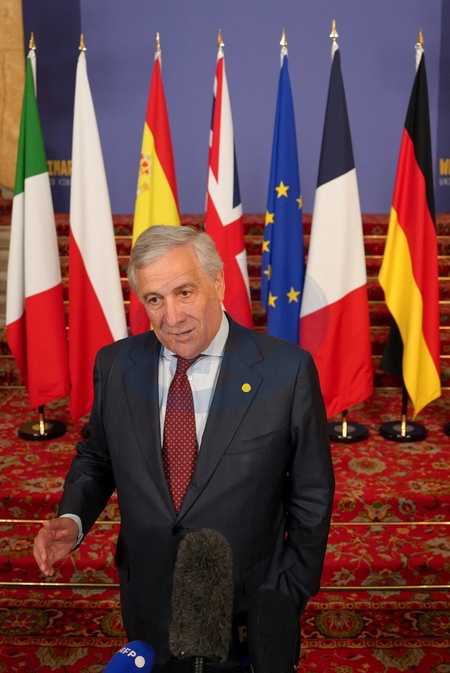 Italy's Foreign Minister Antonio Tajani speaks to the media as he arrives for talks on Ukraine and the future of European security hosted by Britain's Foreign Secretary David Lammy at Lancaster House in London, Britain, May 12, 2025., Credit:Carlos Jasso / Avalon