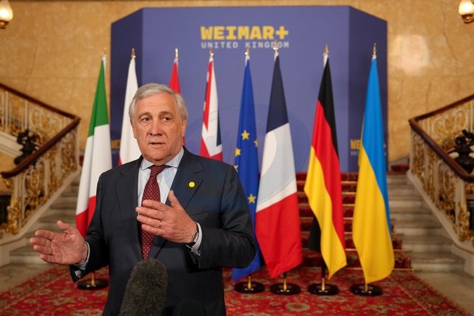 Italy's Foreign Minister Antonio Tajani speaks to the media as he arrives for talks on Ukraine and the future of European security hosted by Britain's Foreign Secretary David Lammy at Lancaster House in London, Britain, May 12, 2025., Credit:Carlos Jasso / Avalon