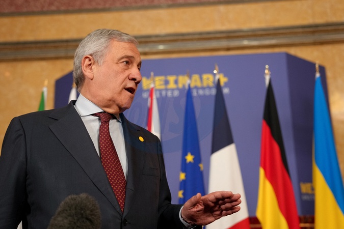 Italy's Foreign Minister Antonio Tajani speaks to the media as he arrives for talks on Ukraine and the future of European security hosted by Britain's Foreign Secretary David Lammy at Lancaster House in London, Britain, May 12, 2025., Credit:Carlos Jasso / Avalon