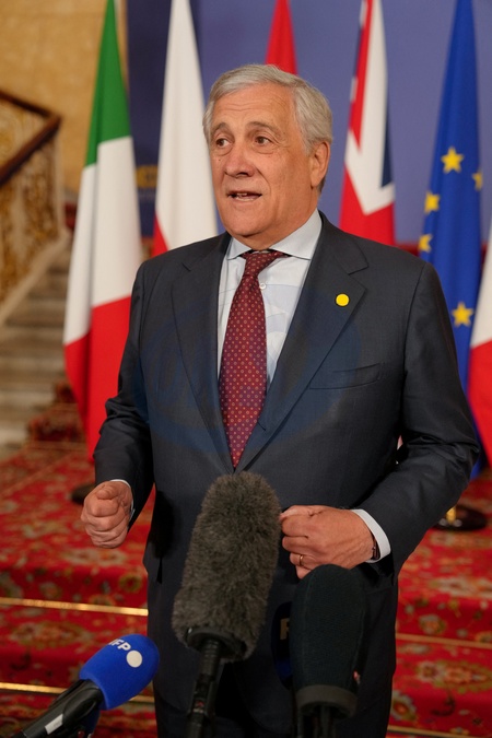 Italy's Foreign Minister Antonio Tajani speaks to the media as he arrives for talks on Ukraine and the future of European security hosted by Britain's Foreign Secretary David Lammy at Lancaster House in London, Britain, May 12, 2025., Credit:Carlos Jasso / Avalon