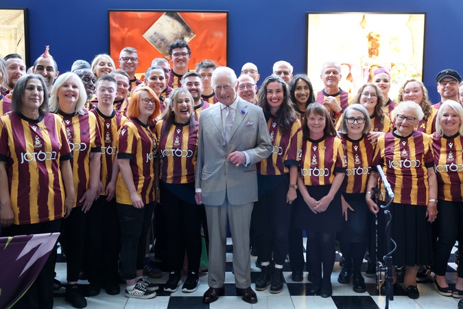 BRADFORD, ENGLAND - MAY 15: King Charles III watches a performance by the Bantam of the Opera choir, a group of local Bradford City Football Club fans taught to sing opera by BBC Radio Leeds during Bradford's City of Culture year at Cartwright Hall, an art gallery and community cultural space in Bradford's Lister Park on May 15, 2025 in Bradford, England. His Majesty will tour the David Hockney gallery, dedicated to the life and career of the Bradford-born artist. The collection includes a unique selection of David Hockney's work from the 1950s and reproductions of personal photos, on display in a public gallery for the first time., Credit:Chris Jackson / Avalon