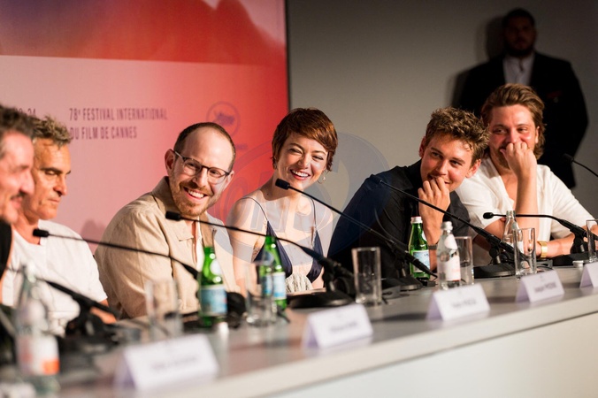 Joaquin Phoenix, Austin Butler, Ari Aster, Emma Stone, Luke Grimes - Conférence de presse du film "Eddington" lors du 78ème Festival International du Film de Cannes. Le 17 mai 2025 © Olivier Borde / Pool / Bestimage Press conference of the film "Eddington" during the 78th Cannes International Film Festival at the Palais des Festivals in Cannes, France. On may 17th 2025