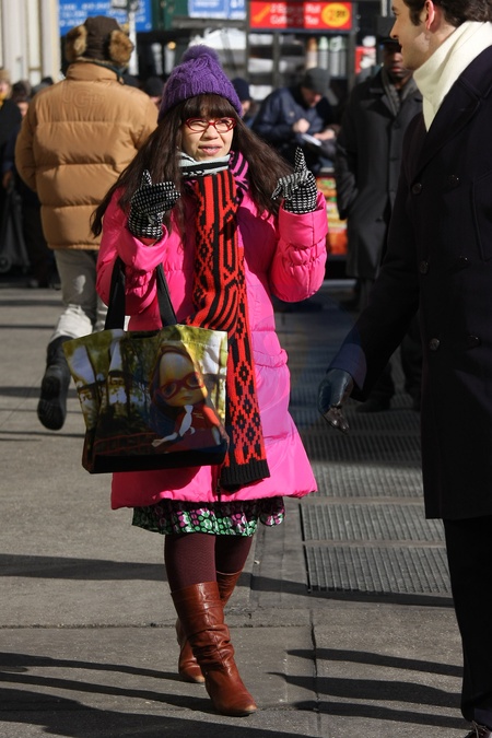 America Ferrera idzie z duza malowana torba, Nowy Jork
