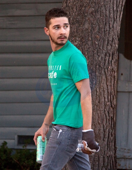 Shia LaBeouf w zielonej koszulce wychodzi ze sklepu, Los Angeles