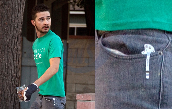 Shia LaBeouf w zielonej koszulce wychodzi ze sklepu, Los Angeles