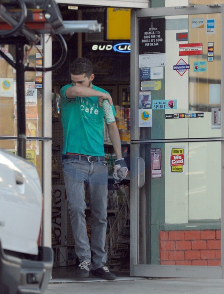 Shia LaBeouf w zielonej koszulce wychodzi ze sklepu, Los Angeles