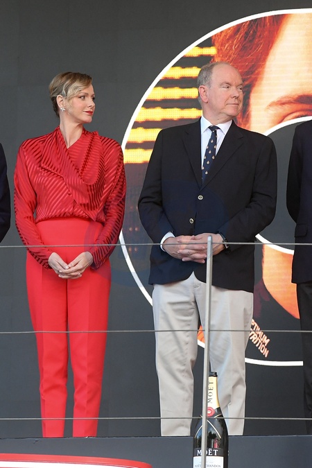 Książę Albert II z Monako i księżniczka Charlène z Monako na podium wyścigu Tag Heuer Formula 1 (F1) Monaco Grand Prix