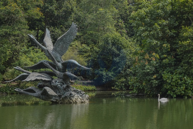 Singapore, Statue of Swans in Lake Singapore Botanic Gardens. The Singapore Botanic Gardens have been inscribed as a UNESCO World Heritage Site in 2015. The Gardens is the first and only tropical botanic garden on the UNESCO World Heritage List. Today, the Gardens is an important botanical institute., Credit:Fabio Mazzarella / Avalon