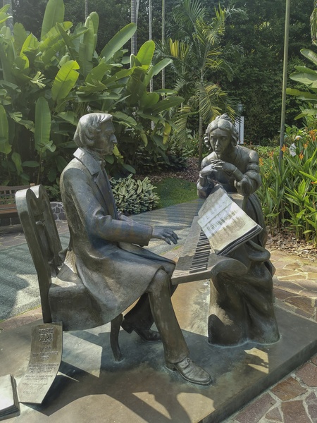 Singapore, The Singapore Botanic Gardens have been inscribed as a UNESCO World Heritage Site in 2015. Today, the Gardens is an important botanical institute. This sculpture is a tribute to one of music greatest composers, Fryderyk Chopin. Sculpted by Karol Badyna and made of bronze overlooks Palm Valley and the Shaw Foundation Symphony Stage, where orchestras play regularly for public audiences., Credit:Fabio Mazzarella / Avalon