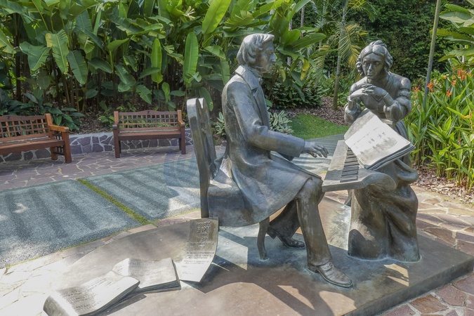 Singapore, The Singapore Botanic Gardens have been inscribed as a UNESCO World Heritage Site in 2015. Today, the Gardens is an important botanical institute. This sculpture is a tribute to one of music greatest composers, Fryderyk Chopin. Sculpted by Karol Badyna and made of bronze overlooks Palm Valley and the Shaw Foundation Symphony Stage, where orchestras play regularly for public audiences., Credit:Fabio Mazzarella / Avalon