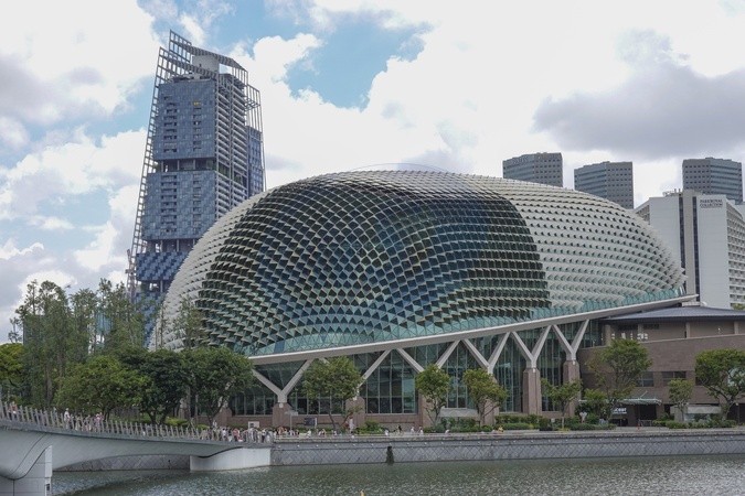 Singapore, the Esplanade Theatres on the Bay nicknamed as The Durian is a performing arts centre, it consists of two rounded structures: one housing a concert hall with about 1,600 seats; and the other a theatre with a capacity of about 2,000 for the performing arts., Credit:Fabio Mazzarella / Avalon