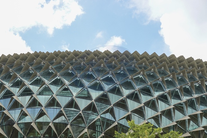 Singapore, the Esplanade Theatres on the Bay nicknamed as The Durian is a performing arts centre, it consists of two rounded structures: one housing a concert hall with about 1,600 seats; and the other a theatre with a capacity of about 2,000 for the performing arts., Credit:Fabio Mazzarella / Avalon