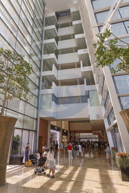 Singapore, Marina Bay Sands is an integrated resort fronting Marina Bay in Singapore and a landmark of the city. The resort includes a 2,561-room hotel, a convention-exhibition centre, Shops at Marina Bay Sands mall, a museum, a large theatre, "celebrity chef" restaurants, two floating crystal pavilions, Art-science exhibits, and the world's largest atrium casino with 500 tables and 1,600 slot machines. The complex includes three towers topped by the Sands Skypark, a skyway connecting 340-metre-long with a capacity of 3,902 people and a 150 m infinity swimming pool, set on top of the world's largest public cantilevered platform, which overhangs the north tower by 66.5 mtr. The 20-hectare resort was designed by Moshe Safdie.Interior view, Credit:Fabio Mazzarella / Avalon
