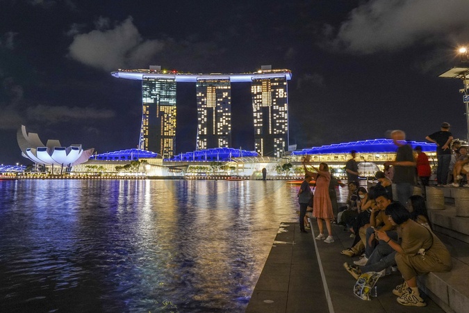 Singapore, Marina Bay Sands is an integrated resort fronting Marina Bay in Singapore and a landmark of the city. The resort includes a 2,561-room hotel, a convention-exhibition centre, Shops at Marina Bay Sands mall, a museum, a large theatre, "celebrity chef" restaurants, two floating crystal pavilions, Art-science exhibits, and the world's largest atrium casino with 500 tables and 1,600 slot machines. The complex includes three towers topped by the Sands Skypark, a skyway connecting 340-metre-long with a capacity of 3,902 people and a 150 m infinity swimming pool, set on top of the world's largest public cantilevered platform, which overhangs the north tower by 66.5 mtr. The 20-hectare resort was designed by Moshe Safdie., Credit:Fabio Mazzarella / Avalon