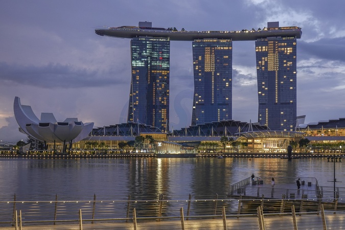 Singapore, Marina Bay Sands is an integrated resort fronting Marina Bay in Singapore and a landmark of the city. The resort includes a 2,561-room hotel, a convention-exhibition centre, Shops at Marina Bay Sands mall, a museum, a large theatre, "celebrity chef" restaurants, two floating crystal pavilions, Art-science exhibits, and the world's largest atrium casino with 500 tables and 1,600 slot machines. The complex includes three towers topped by the Sands Skypark, a skyway connecting 340-metre-long with a capacity of 3,902 people and a 150 m infinity swimming pool, set on top of the world's largest public cantilevered platform, which overhangs the north tower by 66.5 mtr. The 20-hectare resort was designed by Moshe Safdie., Credit:Fabio Mazzarella / Avalon