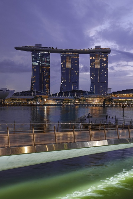 Singapore, Marina Bay Sands is an integrated resort fronting Marina Bay in Singapore and a landmark of the city. The resort includes a 2,561-room hotel, a convention-exhibition centre, Shops at Marina Bay Sands mall, a museum, a large theatre, "celebrity chef" restaurants, two floating crystal pavilions, Art-science exhibits, and the world's largest atrium casino with 500 tables and 1,600 slot machines. The complex includes three towers topped by the Sands Skypark, a skyway connecting 340-metre-long with a capacity of 3,902 people and a 150 m infinity swimming pool, set on top of the world's largest public cantilevered platform, which overhangs the north tower by 66.5 mtr. The 20-hectare resort was designed by Moshe Safdie., Credit:Fabio Mazzarella / Avalon