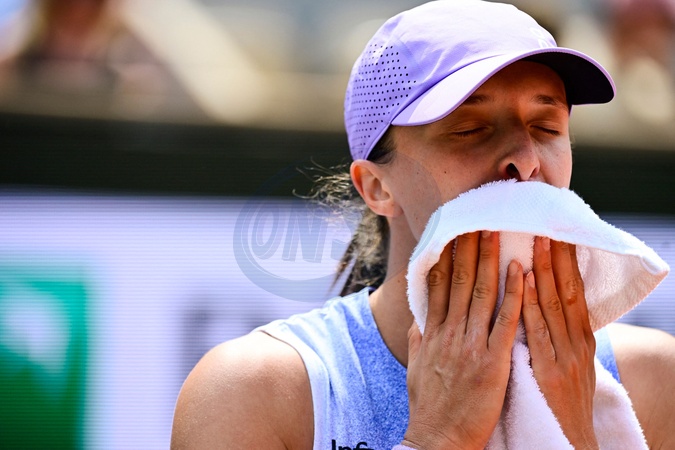 correction iptc Iga Swiatek ( POL ) drying her face with a towel during the 2025 French Open at Roland Garros on Juin 03, 2025 in Paris, France. © Dante Badano/PSNewz/Bestimage