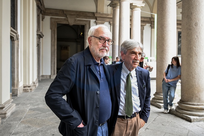 Courtyard of Honor of the Pinacoteca di Brera. Exhibition for Linus' 60th birthday and tribute to Pimpa for her 50th birthday. In the photo: Francesco Tullio Altan and one of the curators (Luca Volpatti). Milan, Italy 03 Jun 2025, Credit:AGF/Nicola Marfisi / Avalon