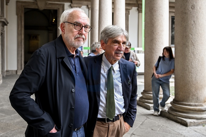 Courtyard of Honor of the Pinacoteca di Brera. Exhibition for Linus' 60th birthday and tribute to Pimpa for her 50th birthday. In the photo: Francesco Tullio Altan and one of the curators (Luca Volpatti). Milan, Italy 03 Jun 2025, Credit:AGF/Nicola Marfisi / Avalon
