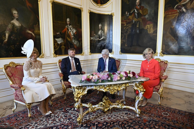 Praag, The Netherlands, 2025-06-04 09:47:04PRAGUE, 04-06-2025, Prague CastleKing Willem Alexander and Queen Máxima pay a state visit to the Czech Republic at the invitation of the President. PHOTO: NLBeeld/Patrick van EmstIn the photo: President Pavel and his wife Eva Pavlová welcome the Royal Couple at the Presidential Palace in Prague with an official welcome ceremony, followed by a tête-a-tête and a delegation meeting. The President and the King then give a short press statement., Credit:Avalon