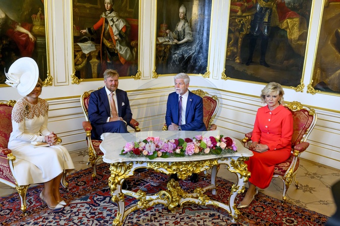 Praag, The Netherlands, 2025-06-04 09:46:33PRAGUE, 04-06-2025, Prague CastleKing Willem Alexander and Queen Máxima pay a state visit to the Czech Republic at the invitation of the President. PHOTO: NLBeeld/Patrick van EmstIn the photo: President Pavel and his wife Eva Pavlová welcome the Royal Couple at the Presidential Palace in Prague with an official welcome ceremony, followed by a tête-a-tête and a delegation meeting. The President and the King then give a short press statement., Credit:Avalon