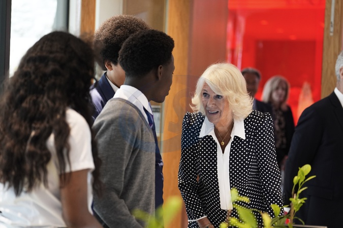 Queen Camilla meeting pupils during a visit to the British Flowers Week 2025 exhibition, at the Garden Museum, London. The exhibition features six immersive floral installations celebrating local, seasonal, British-cut flowers. Picture date: Wednesday June 4, 2025. PA Photo. British Flowers Week champions the UK's cut flower industry, celebrating growers, wholesalers, and florists who work with British-grown flowers. The Garden Museum celebrates the art, history and design of British gardens and the stories of great gardeners., Credit:Jordan Pettitt / Avalon