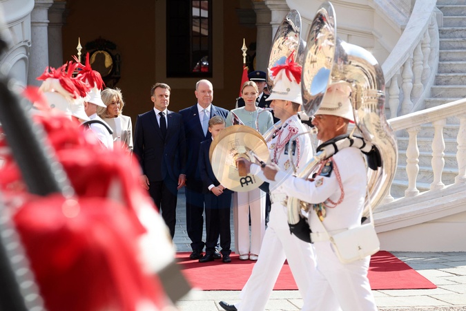 Książę Monako Albert II, księżniczka Charlène i ich dzieci witają prezydenta Emmanuela Macrona, jego żonę Brigitte i delegację w Pałacu Książęcym w Monako.