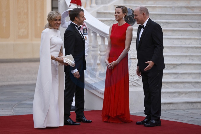 No Tabloïds - Le président Emmanuel Macron, Brigitte Macron, Le prince Albert II de Monaco, La princesse Charlène de Monaco arrivant au dîner d'état en l'honneur de la visite du couple présidentiel français au palais princier à Monaco le 7 juin 2025. © Ludovic Marin / Pool / Bestimage No Tabloïds - No Mail online - Only for OK, Grazia, Hello Prince Albert II of Monaco (R) and Princess Charlene (2nd R) welcome France's President Emmanuel Macron (2nd L) and his wife Brigitte Macron (L) at the Prince's Palace for a state dinner as part of Macron's two-day state visit in Monaco ahead of the Unoc3 on June 7, 2025. The EU will present the new roadmap at the June 9-13 UN Ocean Conference (UNOC), which is set to draw some 70 heads of state and government to southern France.