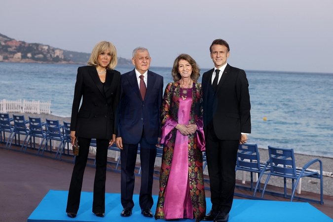 Le président Emmanuel Macron, sa femme Brigitte Macron avec Abdel Latif Rachid, président de l'Irak et sa femme Shanaz Ibrahim Ahmad avant le dîner de la conférence des Nations Unies sur l'Océan (UNOC3) à Nice le 8 juin 2025 © Dominique Jacovides / Bestimage Dinner for the United Nations Ocean Conference (UNOC3) in Nice on 8 June 2025