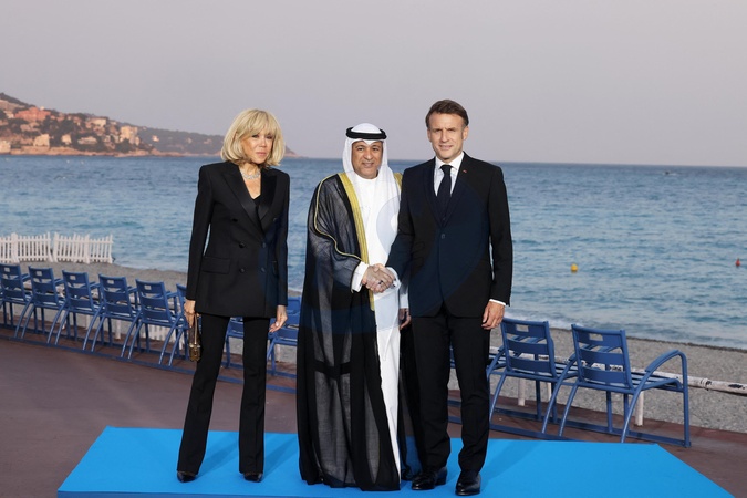 Prezydent Emmanuel Macron i jego żona Brigitte Macron witają gości na kolacji Konferencji Narodów Zjednoczonych ds. Oceanów (UNOC3) w Nicei