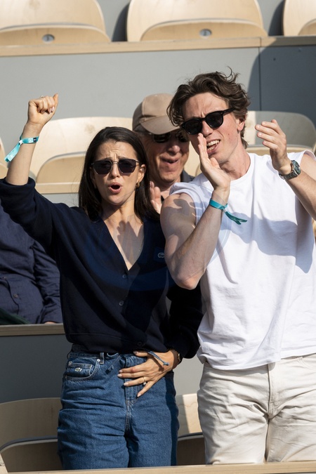 Marisa Abela et son compagnon Jamie Bogyo, en tribunes lors de la finale messieurs des Internationaux de France de Tennis de Roland Garros 2025 (jour 15), à Paris, France, le 8 juin 2025. © Cyril Moreau/Bestimage Celebs in the stands during the 2025 French Open Tennis Championships Men's Final at Roland Garros (Day 15), in Paris, France, on June 8th, 2025. © Cyril Moreau/Bestimage