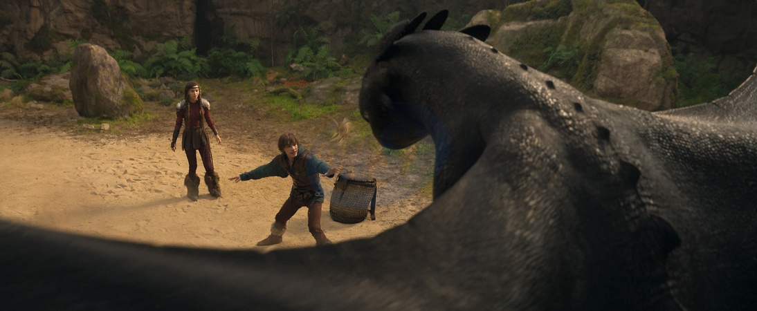 (from left) Astrid (Nico Parker), Hiccup (Mason Thames) and Night Fury dragon, Toothless "How to Train Your Dragon" (2025), Credit:Universal Pictures / Avalon