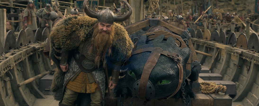 (from left) Stoick (Gerard Butler) and Night Fury dragon, Toothless "How to Train Your Dragon" (2025), Credit:Universal Pictures / Avalon