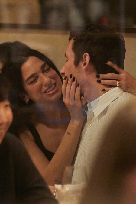 Exclusif - Prix Spécial - No Web - La chanteuse Dua Lipa et son nouveau fiancé l'acteur Callum Turner ont dîné en amoureux au restaurant "Parcelles" dans le quartier du Marais à Paris