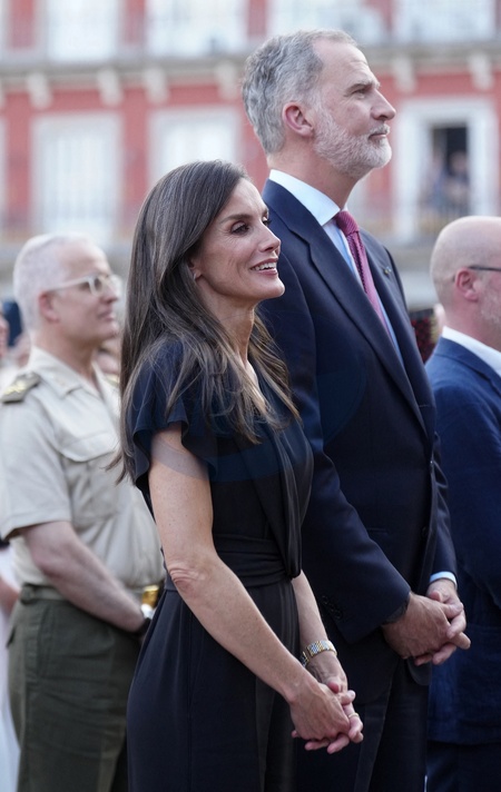 Le roi Felipe VI d'Espagne et la reine Letizia lors du concert de la garde royale en l'honneur du 10ème anniversaire de leur couronnement sur la Plaza Mayor à Madrid le 18 juin 2025. King Felipe VI and Queen Letizia attend the Royal Guard Concert in honour of their Coronation 10th Anniversary at the Plaza Mayor. Madrid - June 18, 2026