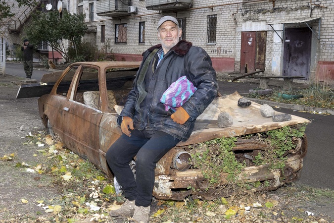 A man on the wreck of a car in Donbass, Ukraine, 07/11/2024. © Nicolas Dykmas/Bestimage