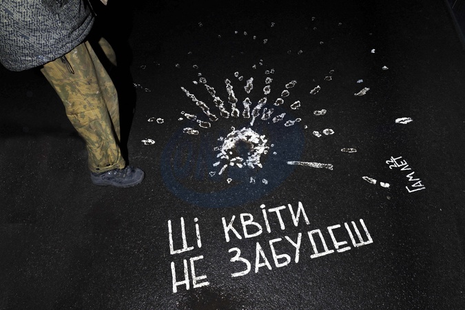 "you will not forget these flowers", a shrapnell impact dyed with white paint and a graffiti, Kharkiv, Ukraine, 09/11/2024. © Nicolas Dykmas/Bestimage