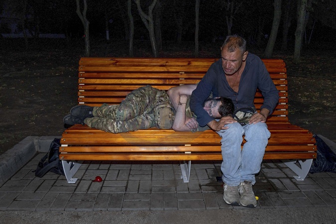 Homeless man conforting a young soldier, in Kramatorsk, Ukraine, 17/08/2024. © Nicolas Dykmas/Bestimage