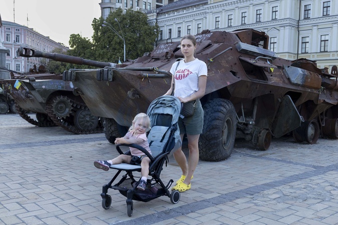 A woman and her child next to exhibited tanks and MV's in Kyiv's freedom square, Ukraine, 06/08/2024. © Nicolas Dykmas/Bestimage