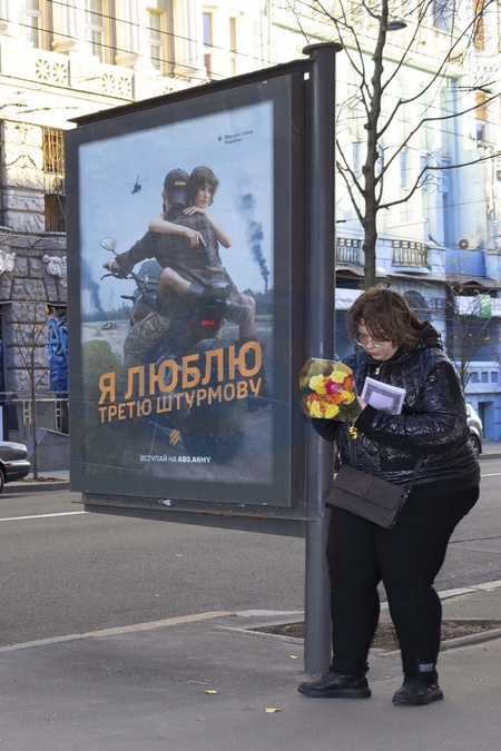 woman and third brigade billboard, Kharkiv, Ukraine, 09/11/2024. © Nicolas Dykmas/Bestimage