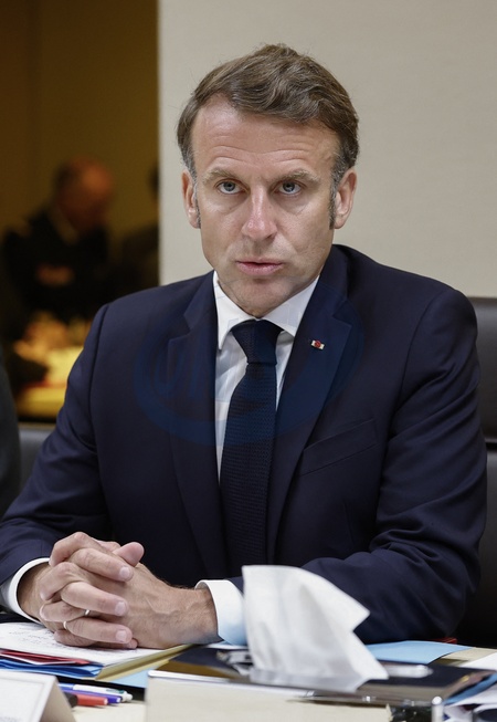 French President Emmanuel Macron flanked by French Presidency General Secretary Emmanuel Moulin and France's General Fabien Mandon attends a national security meeting on the crisis between Israel and Iran in the Jupiter room at the Elysee Palace in Paris, France, June 22, 2025. © Benoit Tessier/Pool/Bestimage