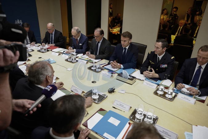 French President Emmanuel Macron flanked by French Presidency General Secretary Emmanuel Moulin and France's General Fabien Mandon attends a national security meeting on the crisis between Israel and Iran in the Jupiter room at the Elysee Palace in Paris, France, June 22, 2025. © Benoit Tessier/Pool/Bestimage