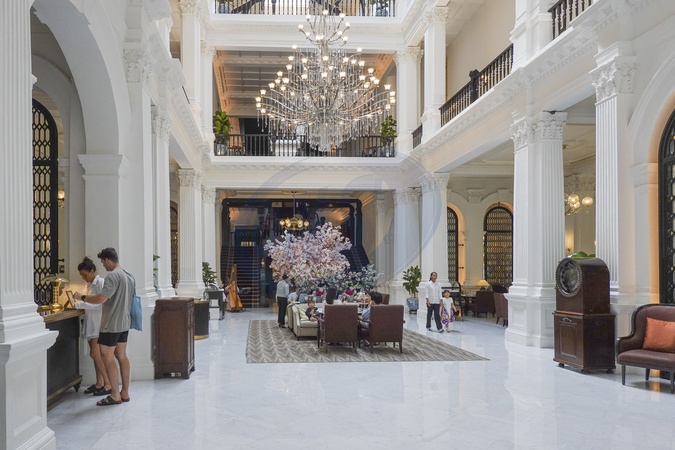 Singapore, Raffles Hotel is a colonial-style hotel built by Armenian hoteliers, the Sarkies Brothers, in 1887. The Raffles Hotel is renowned for its colonial-era architecture, elegant interiors, and classic ambiance, which have transformed the hotel into a symbol of timeless luxury and sophistication.Photo © Fabio Mazzarella/Sintesi *** Local Caption ***, Credit:Fabio Mazzarella / Avalon