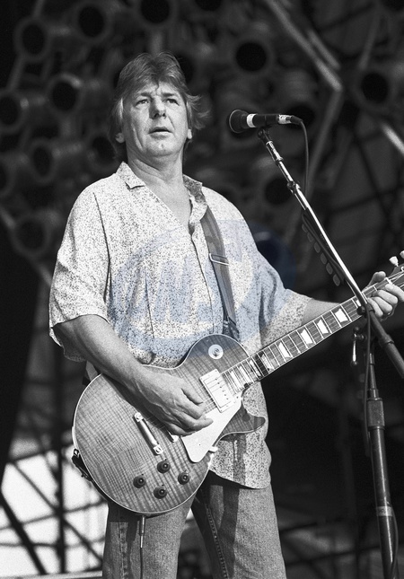 Guitarist and songwriter Mick Ralphs is shown performing on stage during a live concert appearance with Bad Company.